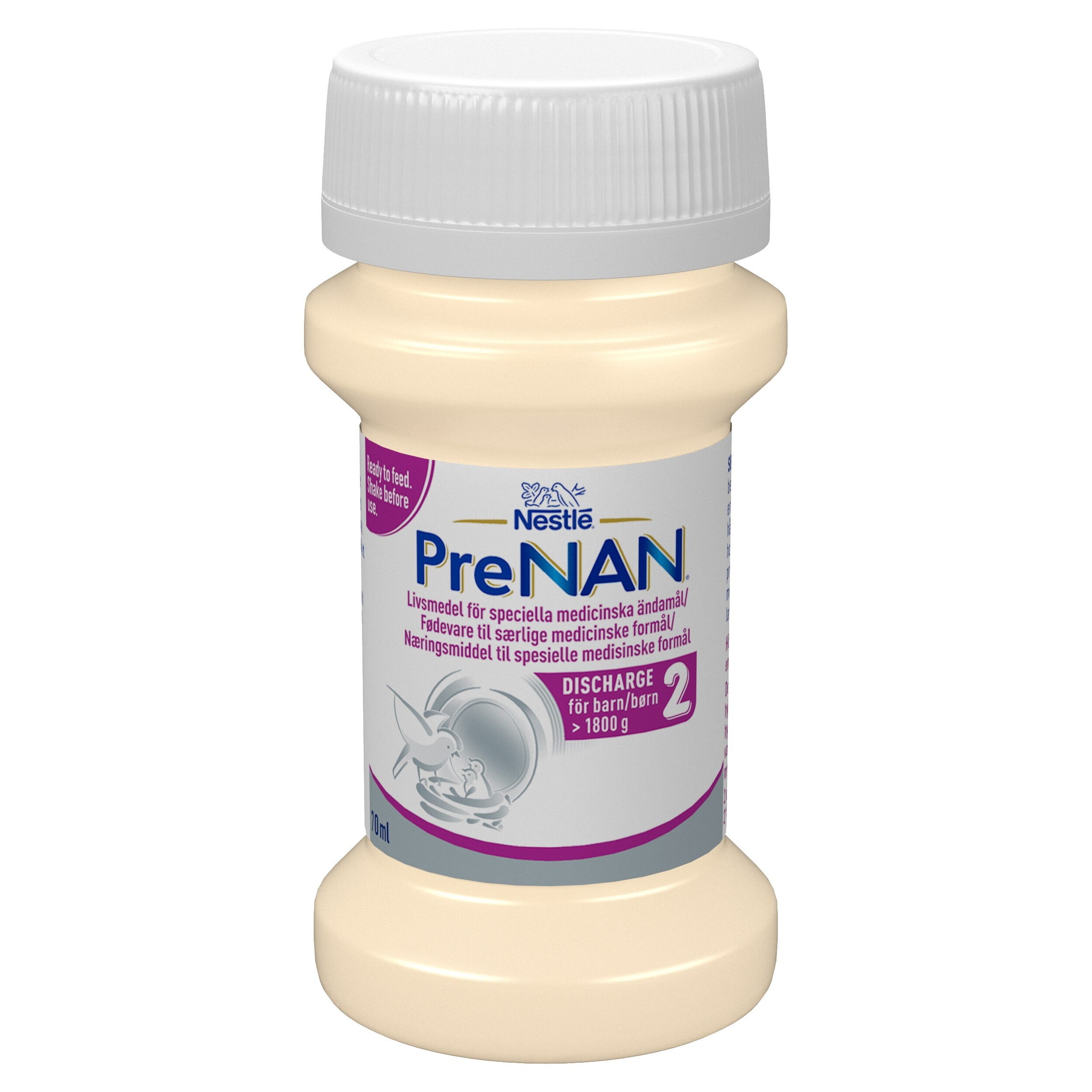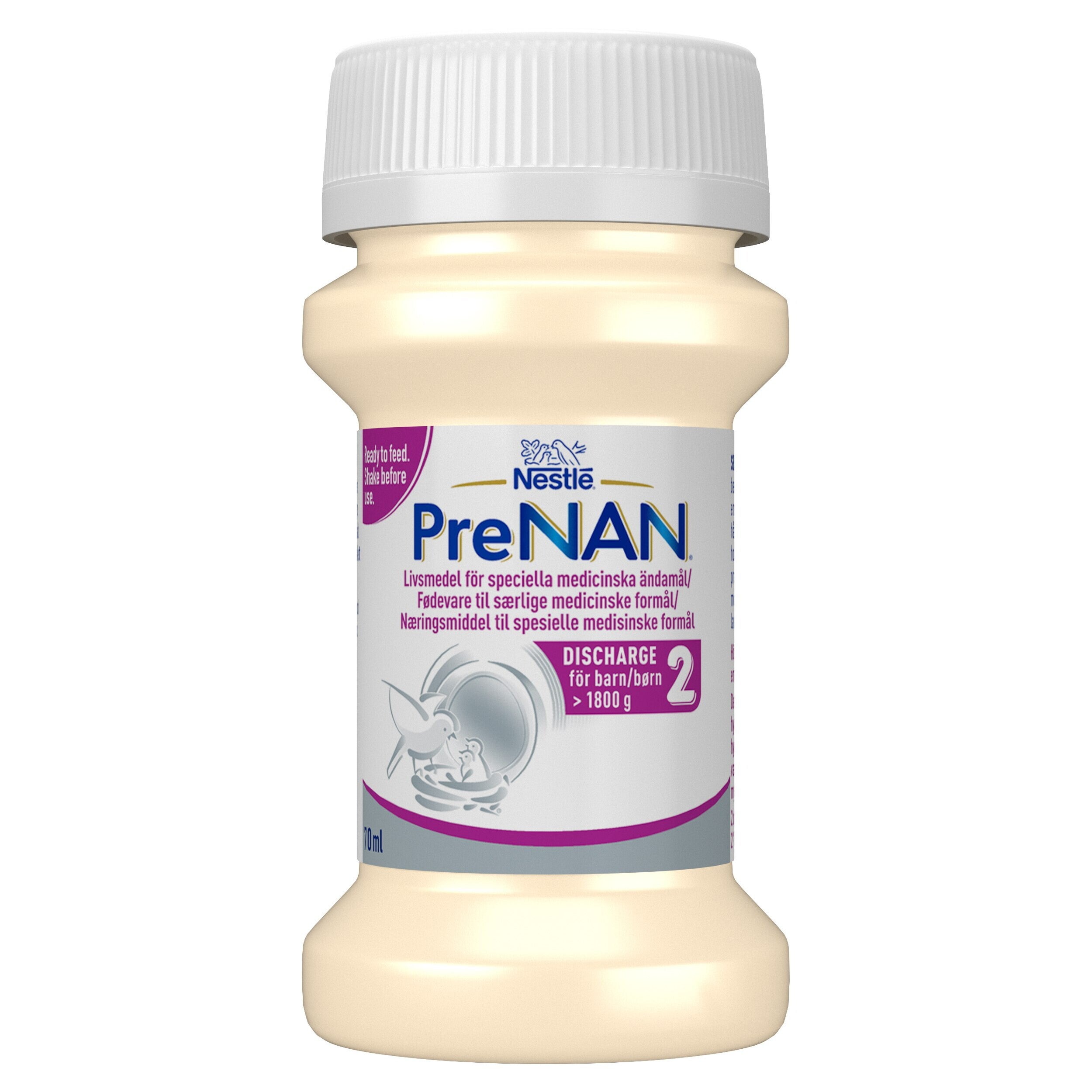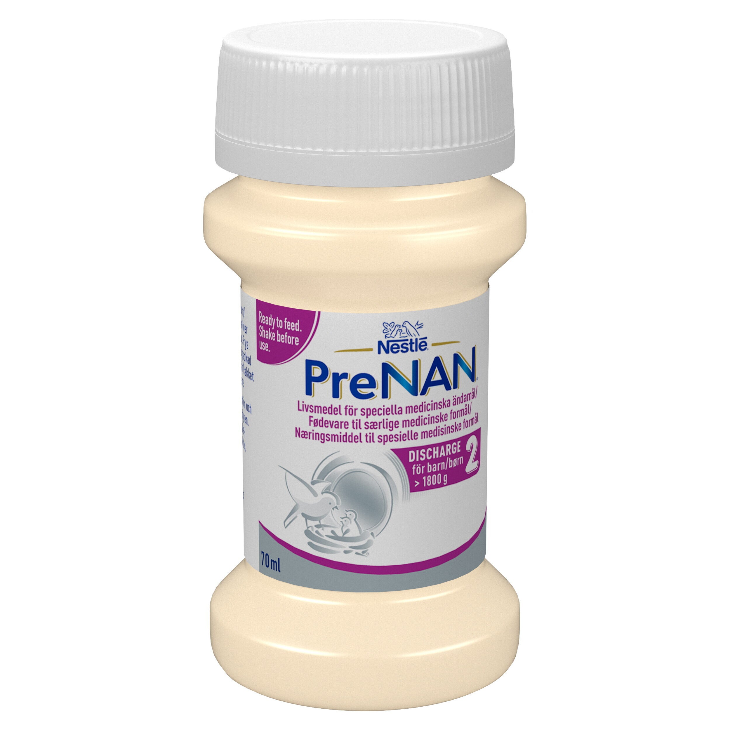 PreNAN® DISCHARGE 2 er ernæringsmessig fullverdig og tilpasset for å dekke ernæringsbehovene for premature spedbarn med lav fødselsvekt (> 1800 g) under deres raske vekst etter utskrivelse fra sykehuset. Egnet som eneste ernæringskilde.